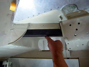 ![]() フロアーパネルを下から見上げるとフロアー補強の為の 無数のリベットが確認出来ます。 エキゾーストマニホールドの逃げの加工があります。 |