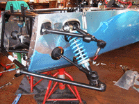 リアサスペンションの組みつけ U 最初にロールバーを組んでおき, リアサスペンションを組みつける。 ショックアブソーバーに捻れの力が 加わらない様にボルトにグリスを塗って 組み付ける。 |