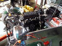 エンジン組み付け V エンジンマウントを固定し、 セルモーター、オルタネーター、ファンベルト デスビ,インテークマニホールド,キャブ等 捕機類を組みつけます。 |