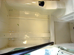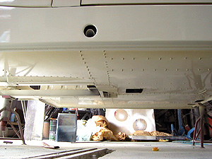 ![]() フロアーパネルを下から見上げるとフロアー補強の為の 無数のリベットが確認出来ます。 エキゾーストマニホールドの逃げの加工があります。 |