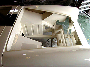 ![]() フロアーにも補強の為のスチール角パイルが追加されて います。この細いフレームがバルクヘッドを貫通し エンジンルーム内のメンバーにまでつながっています。 同時にセンタートンネル部の強度も上げています。 |