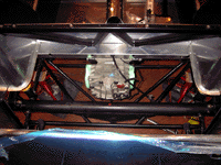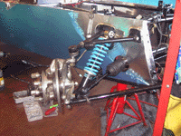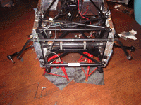 | リアサスペンションの組みつけ V ショックの前部のフレームに 三角のボックスがありますが 巻上げ式のシートベルトが入るスペースです。 |