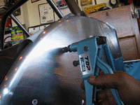 リアフェンダー組み付け T リアフェンダーの取り付け位置は フェンダー側に穴をあけておいて それに合わせる方が確実です ここでナッターと言う工具で ナットを埋め込みます。 |